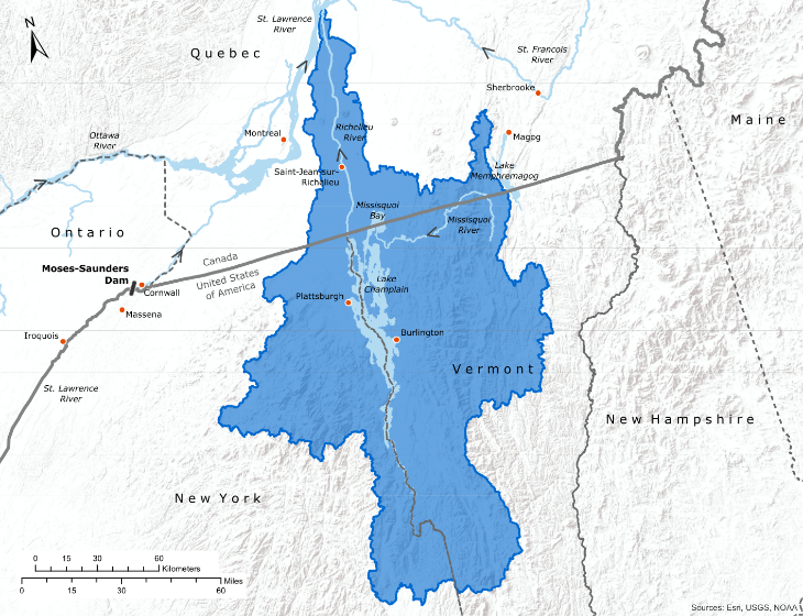 Lake Champlain sits between New York and Vermont, and stretches north into Quebec, where it drains into the Richelieu River – and in turn, the St. Lawrence River. The IJC currently has two references underway in the area: one to look at flooding in the Lake Champlain-Richelieu River system, and another to look at water quality in the lake’s Mississquoi Bay and the nearby Lake Memphremagog. Credit: Esri, USGS, NOAAThe Lake Champlain-Richelieu River flooding study