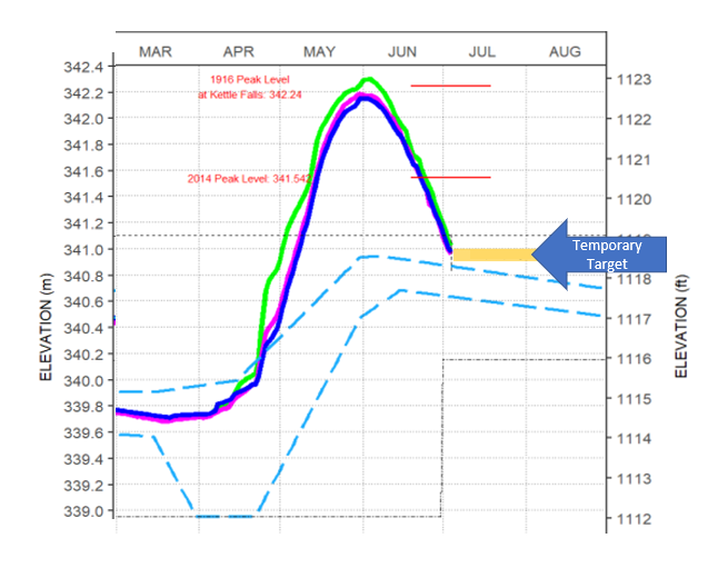 The Water Levels Committee has directed the dam operators to make a minor adjustment to the target for Namakan Lake level in order to slightly speed up the rate of decline of Rainy Lake. The temporary target range is 340.90 m to 341.0 m, a range of 10 cm (4 in) centered on the level of the 1970 Upper Rule Curve, 340.95 m(1118.6 ft). This level is also the top of the 2018 Rule Curves in early June, but the 2018 Rule Curves drop gradually over the summer rather than holding flat (see graph).